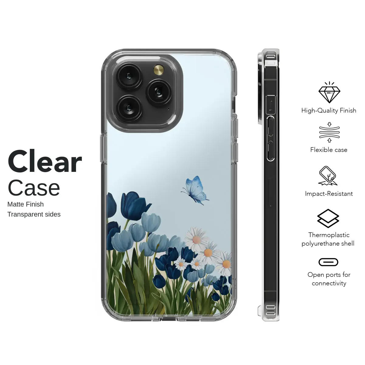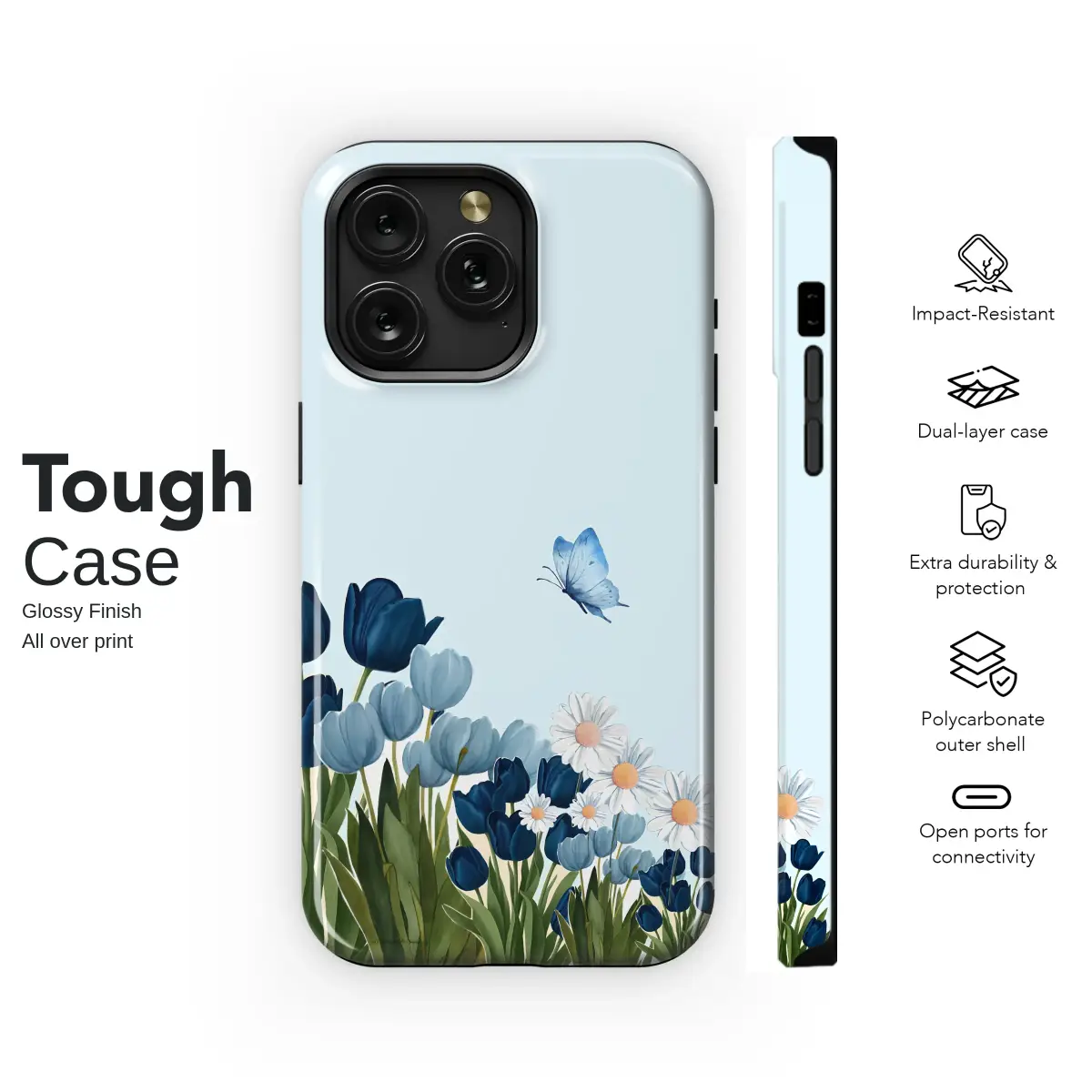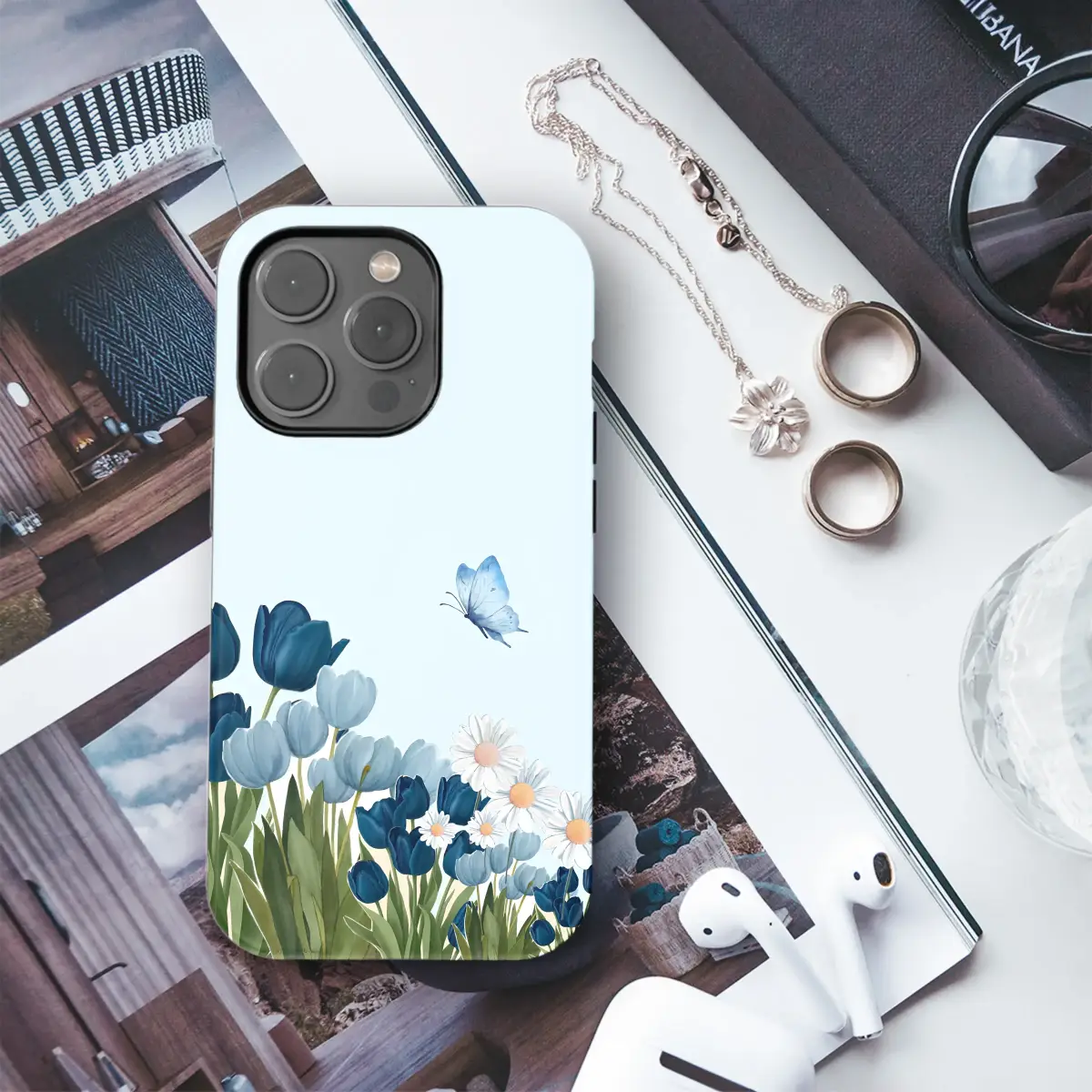 Blue Tulip Butterfly Garden Floral Illustration Phone Case Cover for iPhone 17 Pro Max 16 15 13 Samsung S26 S25 Pixel 10078