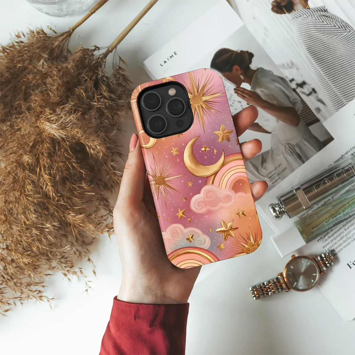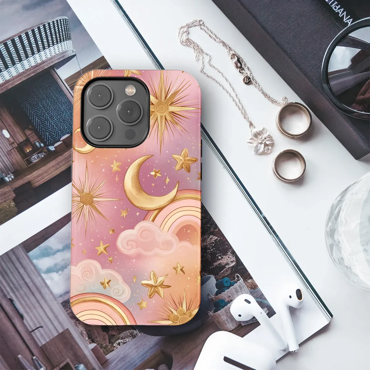 Adorn your accessory with a touch of magic. This celestial design captures a dreamy, whimsical sky filled with shimmering gold moons, stars, and suns. Set against a beautiful pastel gradient of pink, purple, and orange, the artwork is complemented by soft clouds and subtle rainbows, creating an enchanting and mystical aesthetic.