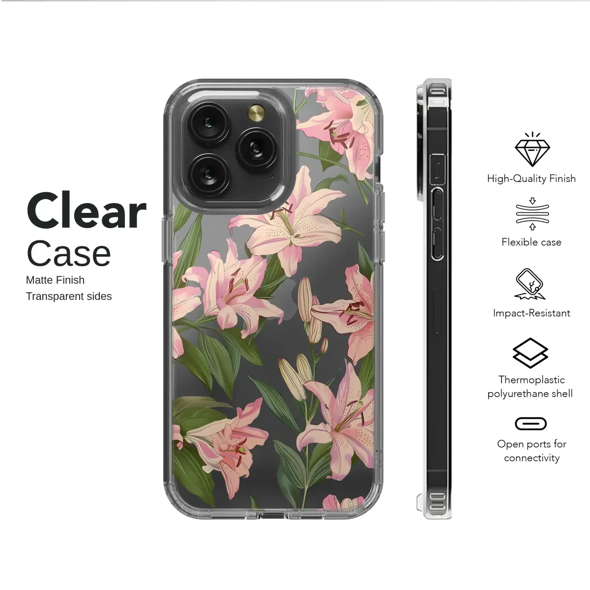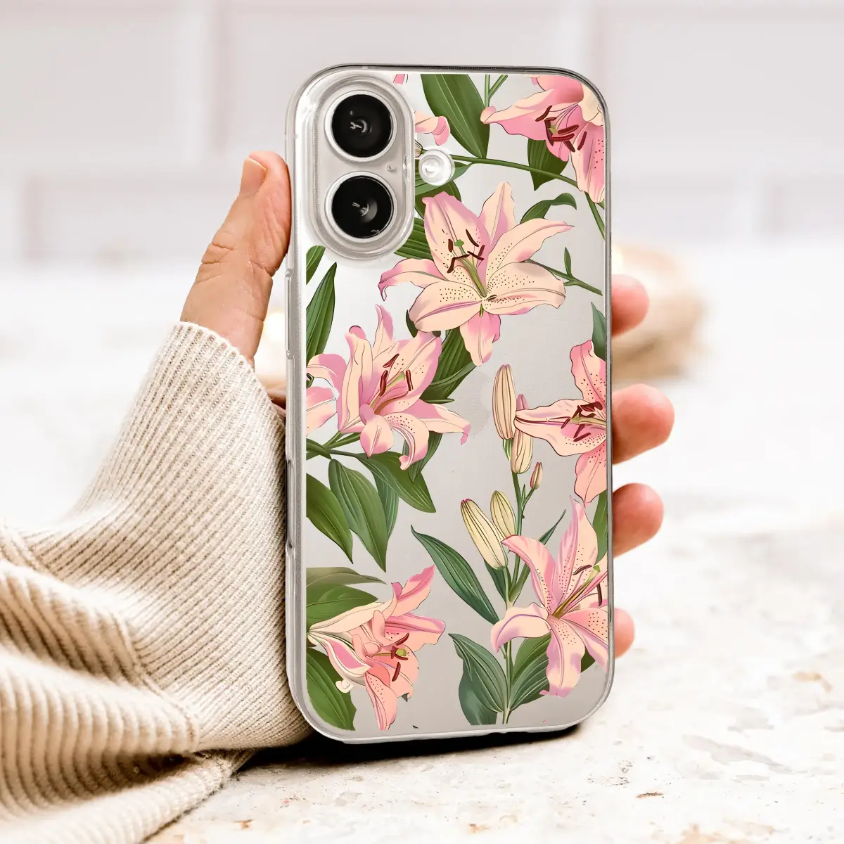 Clear Clear Pink Lily Botanical Floral Illustration Phone Case Cover for iPhone 17 Pro Max 16 15 Plus 14 13 Mini Samsung S26 S25 Pixel 10 9 10087