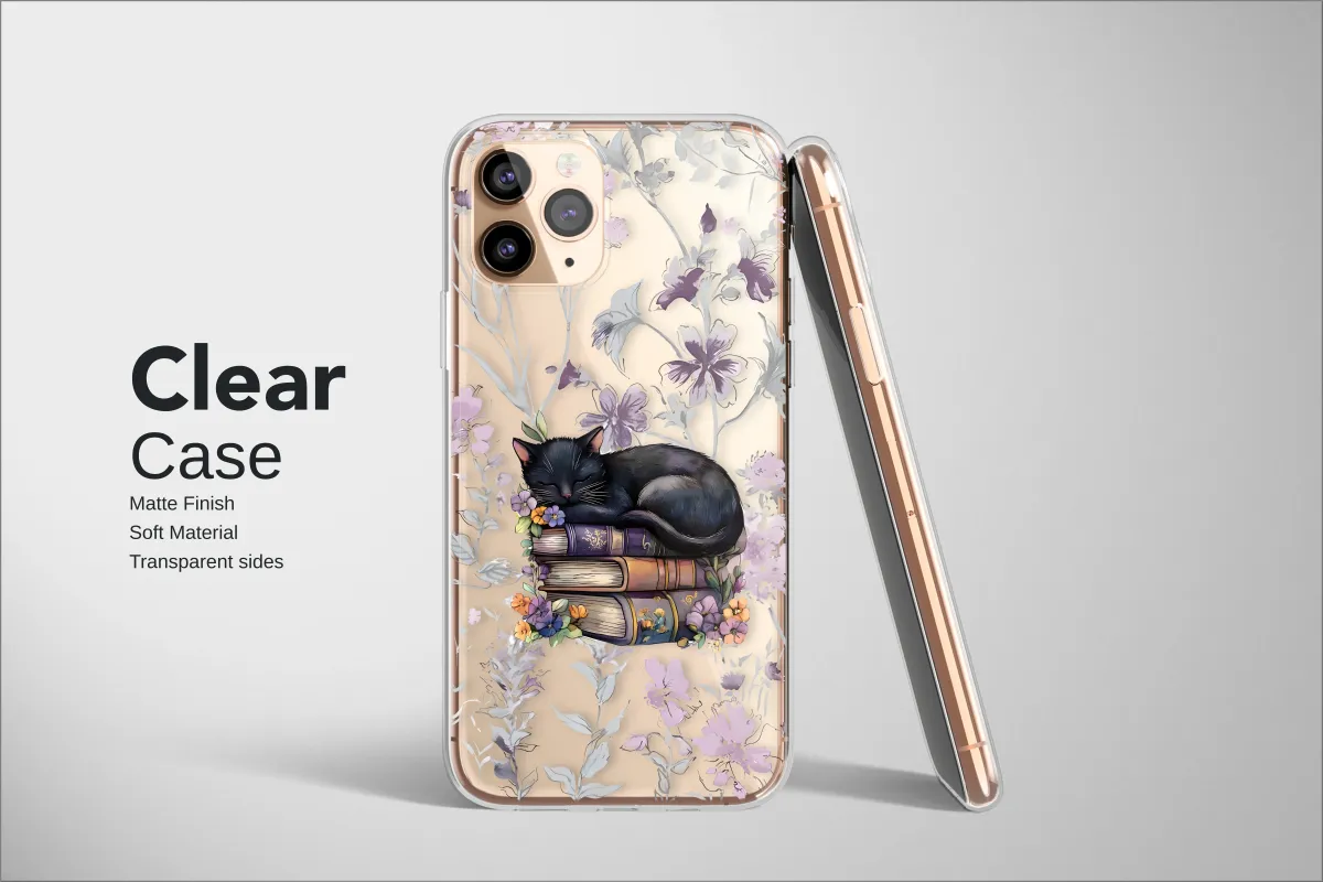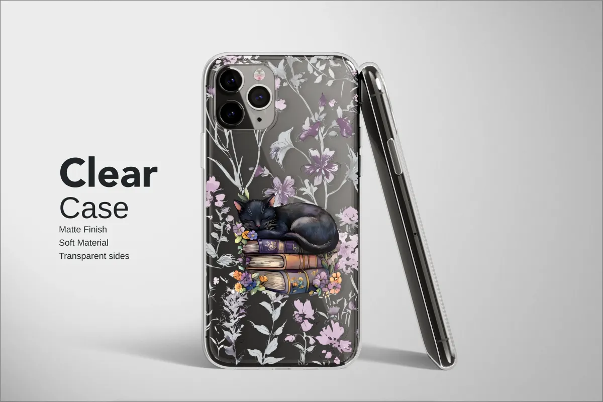 Clear Clear Sleeping Black Cat on Books Whimsical Floral Art Phone Case Cover for iPhone 17 Pro Max 16 15 13 Samsung S25 S24 Pixel 9368